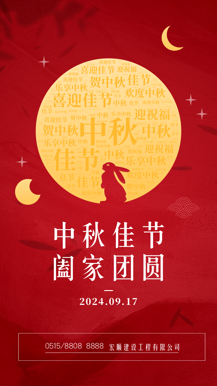 在這金秋送爽、丹桂飄香的美好時節,我們迎來了又一年的中秋佳節。月滿中秋,人團圓,自古以來,這輪明月便承載著無數人的思念與期盼,成為了中華民族傳統文化中不可或缺的一部分。值此佳節之際,宏順建設愿以真摯的心意,編織成最溫馨的祝賀詞,獻給每一位遠方的親人、摯友,以及在這團圓夜里,或許因種種原因未能相聚的人們。